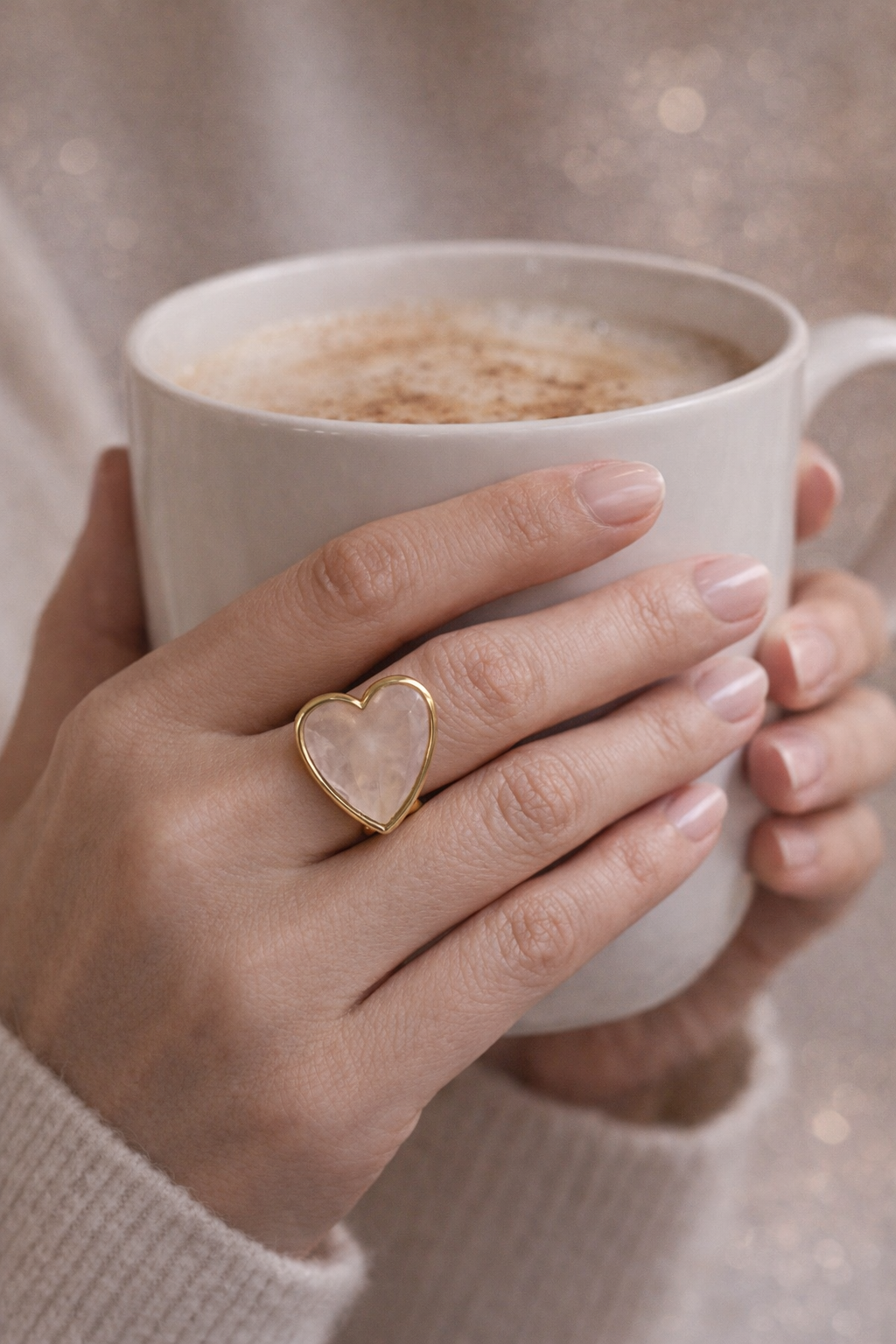 Lleva siempre contigo una pieza que es puro sentimiento y luz. Este romántico anillo ha sido diseñado para quienes buscan una joya con significado, capaz de transmitir serenidad en cada gesto. El protagonista absoluto de la pieza es un espectacular corazón de Cuarzo Rosa natural, cuidadosamente tallado para resaltar sus suaves tonalidades rosadas y su brillo vítreo característico. Conocido como la piedra del amor incondicional, este cuarzo aporta una calidez única que ilumina tus manos de forma instantánea.