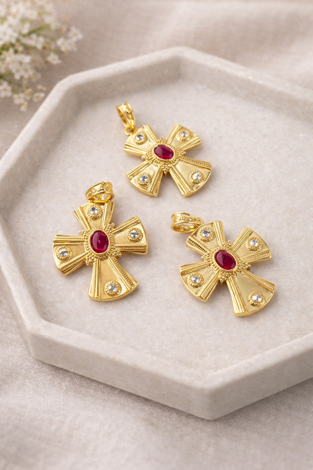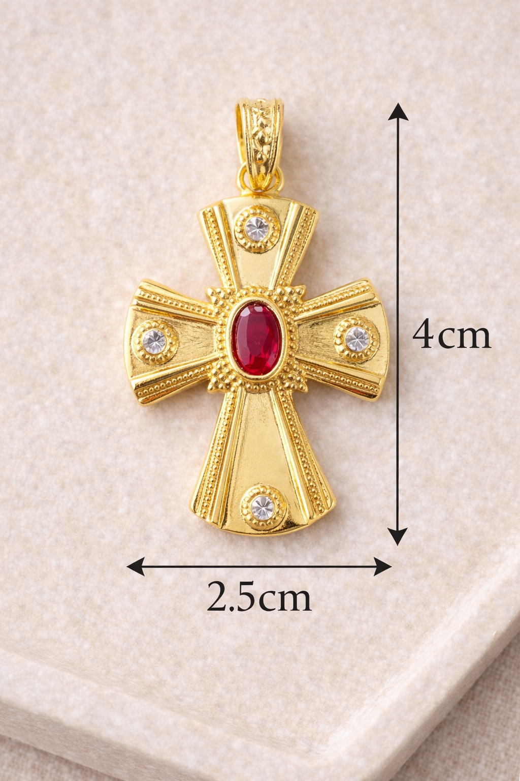 Pedrería: Cuatro cristales blancos incrustados y un cristal central rojo rubí.