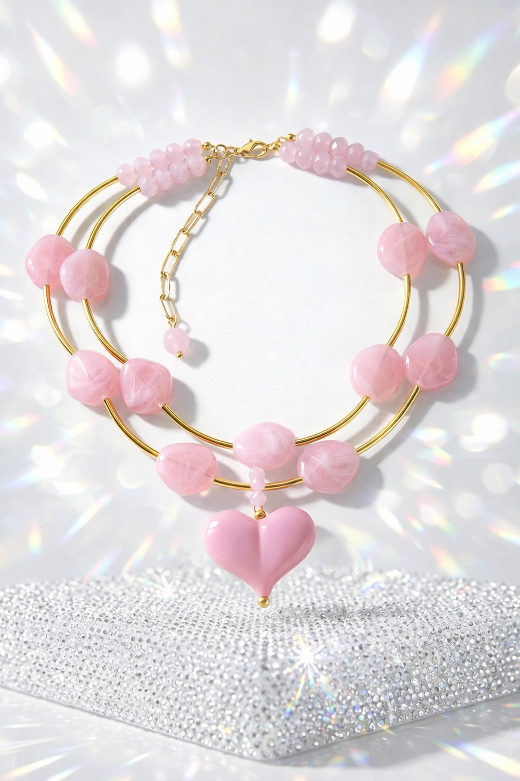 Una pieza que irradia dulzura, feminidad y pura luz. Este espectacular collar de diseño doble está creado para ser el protagonista absoluto de tu cuello y elevar tu joyero al siguiente nivel. Elaborado minuciosamente sobre una resistente estructura de acero con un impecable baño galvánico de oro de 18 micras, el diseño intercala voluminosas cuentas de resina laminada en un favorecedor tono rosa empolvado con el brillo sutil de los delicados cristales facetados.
