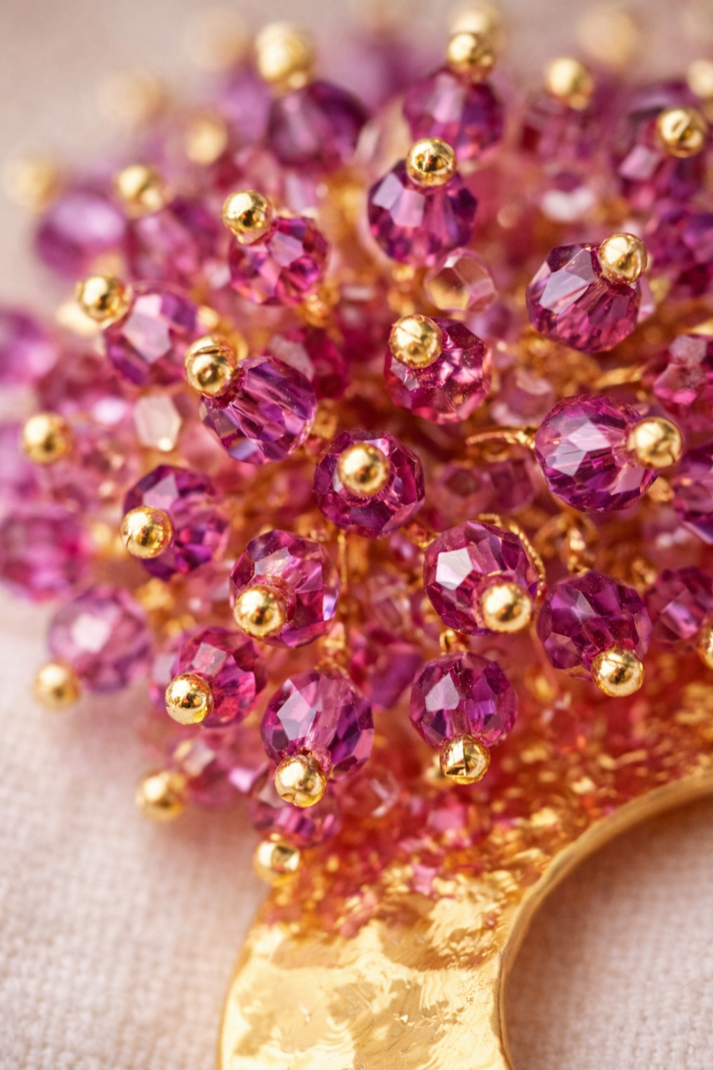 Parte superior: Cristales cosidos a mano en dos tonalidades vibrantes (lila y violeta fuerte).