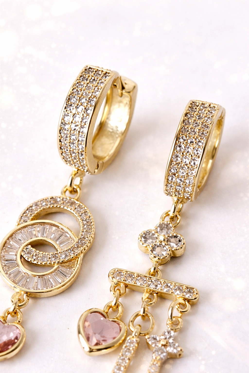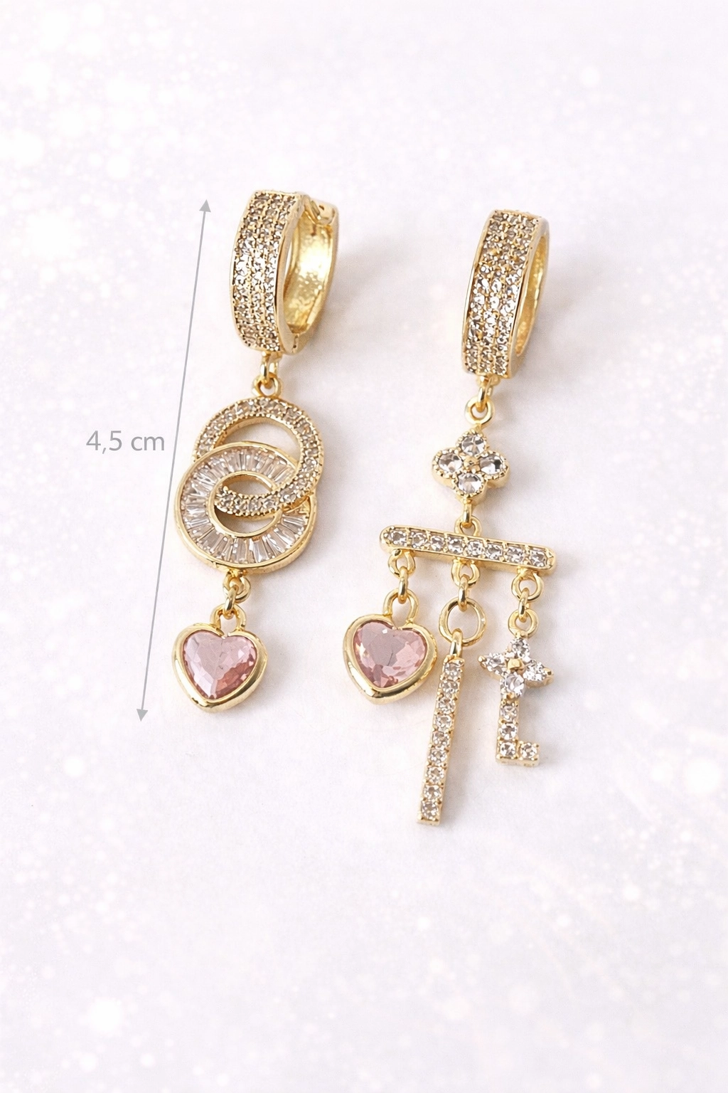 Rompe las reglas establecidas y marca tu propio estilo con estos maravillosos pendientes asimétricos, una pieza verdaderamente única y cargada de una abrumadora personalidad y mimo artesanal. Partiendo de una base luminosa y elegante formada por unas argollas de latón de alta calidad, minuciosamente iluminadas con un brillante pavé de circonitas, el diseño evoluciona de forma mágica y sorprendente jugando con originales geometrías cruzadas y destellos de luz transparentes.